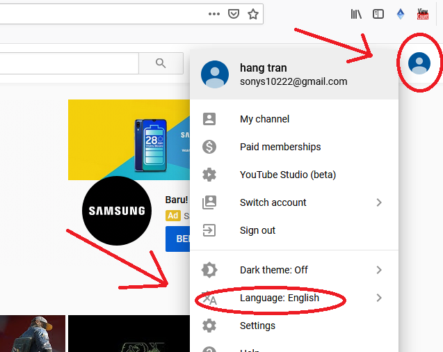 tiếp theo các bạn cần đăng nhập youtube.com .sau đó bấm vào hình đại diện góc màn hình và chọn ngôn ngữ là ENGLISH